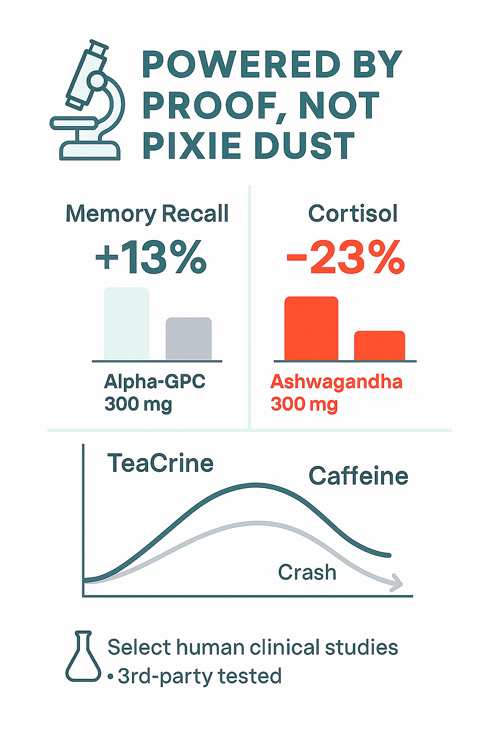We were over the pixie-dust. So we built feel-it formulas with transparent labels and clinically sensible doses. No fairy dust. No jitter clown shows. Just smart nutrition that respects your time, your brain, and your sleep schedule.